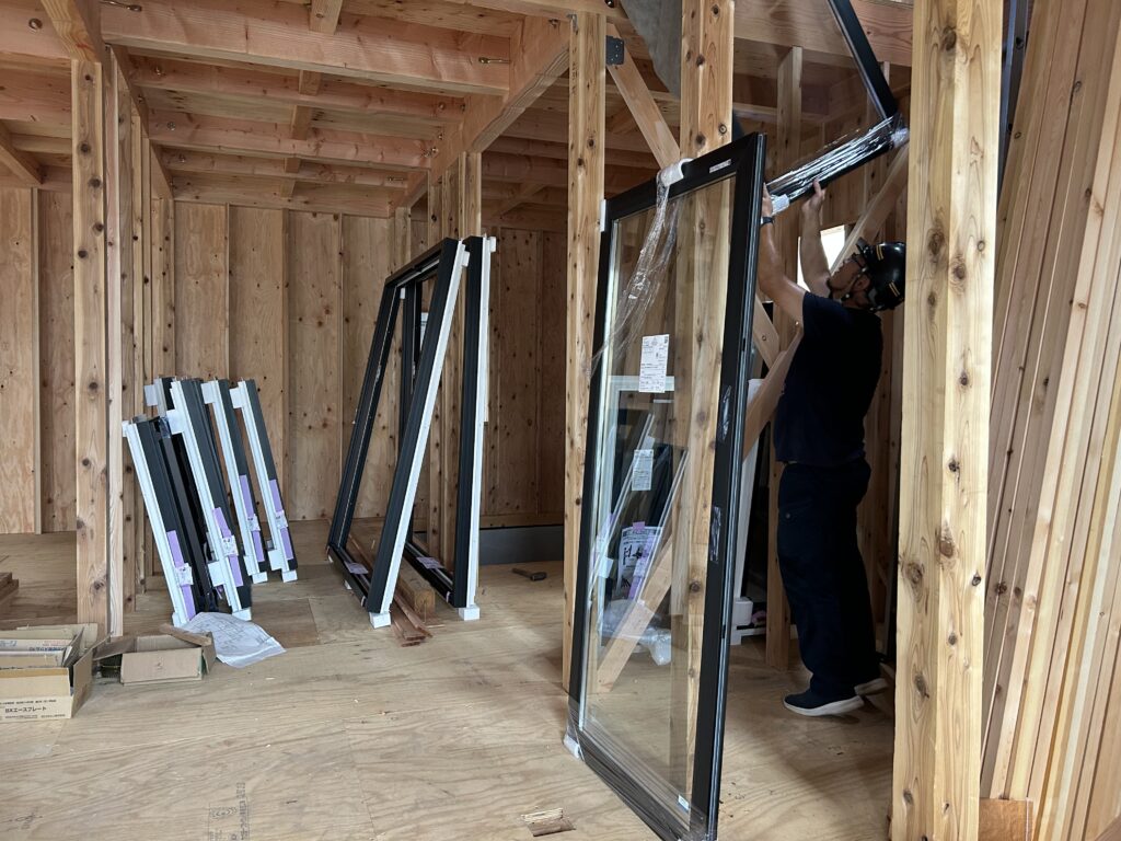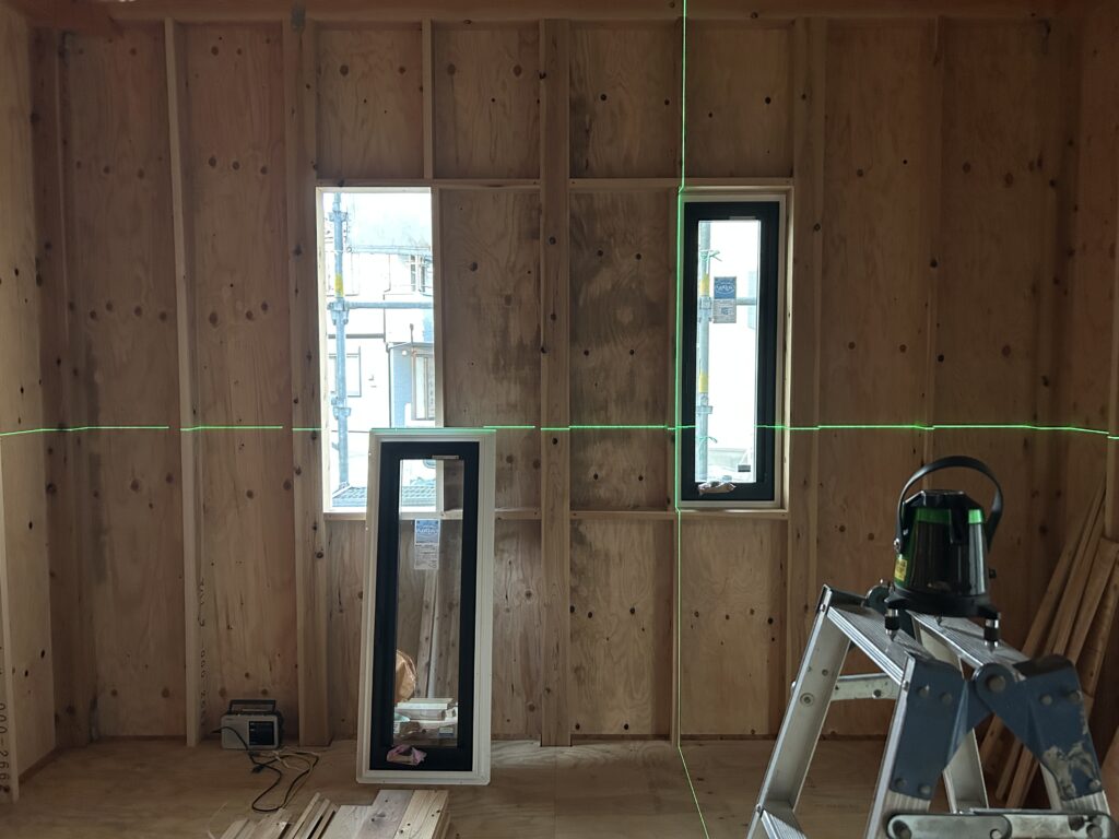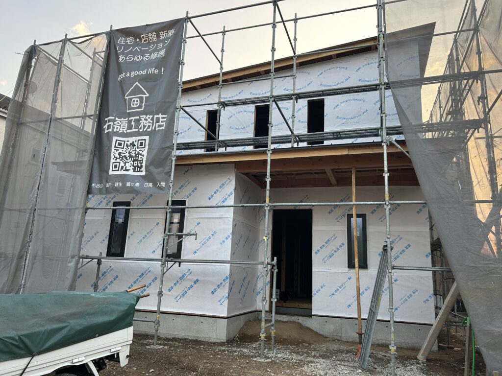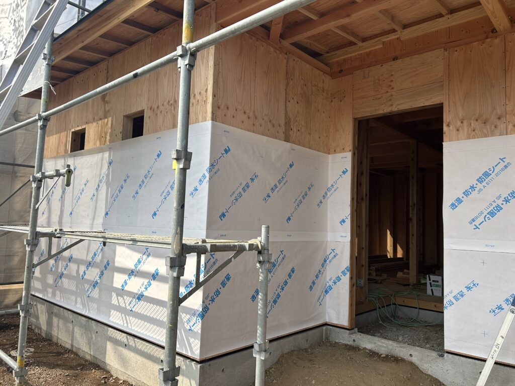 外壁に防水シート貼ってます… 雨水を防水して、内側の湿気を外に排出する優秀なシートです✨ 隙間なく丁寧に施工します…