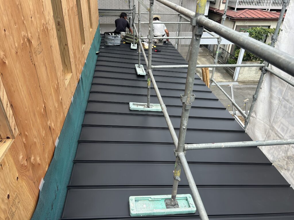 外壁に防水シート貼ってます… 雨水を防水して、内側の湿気を外に排出する優秀なシートです✨ 隙間なく丁寧に施工します…早野親子が屋根工事やってくれています…良い息子…