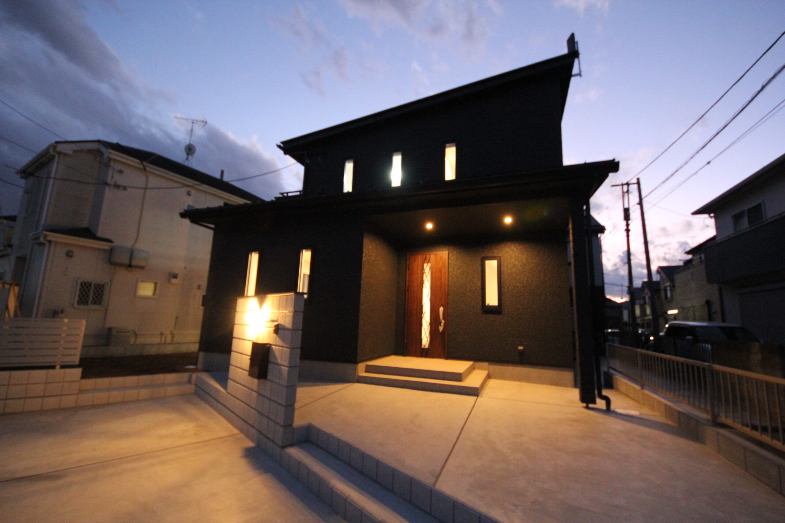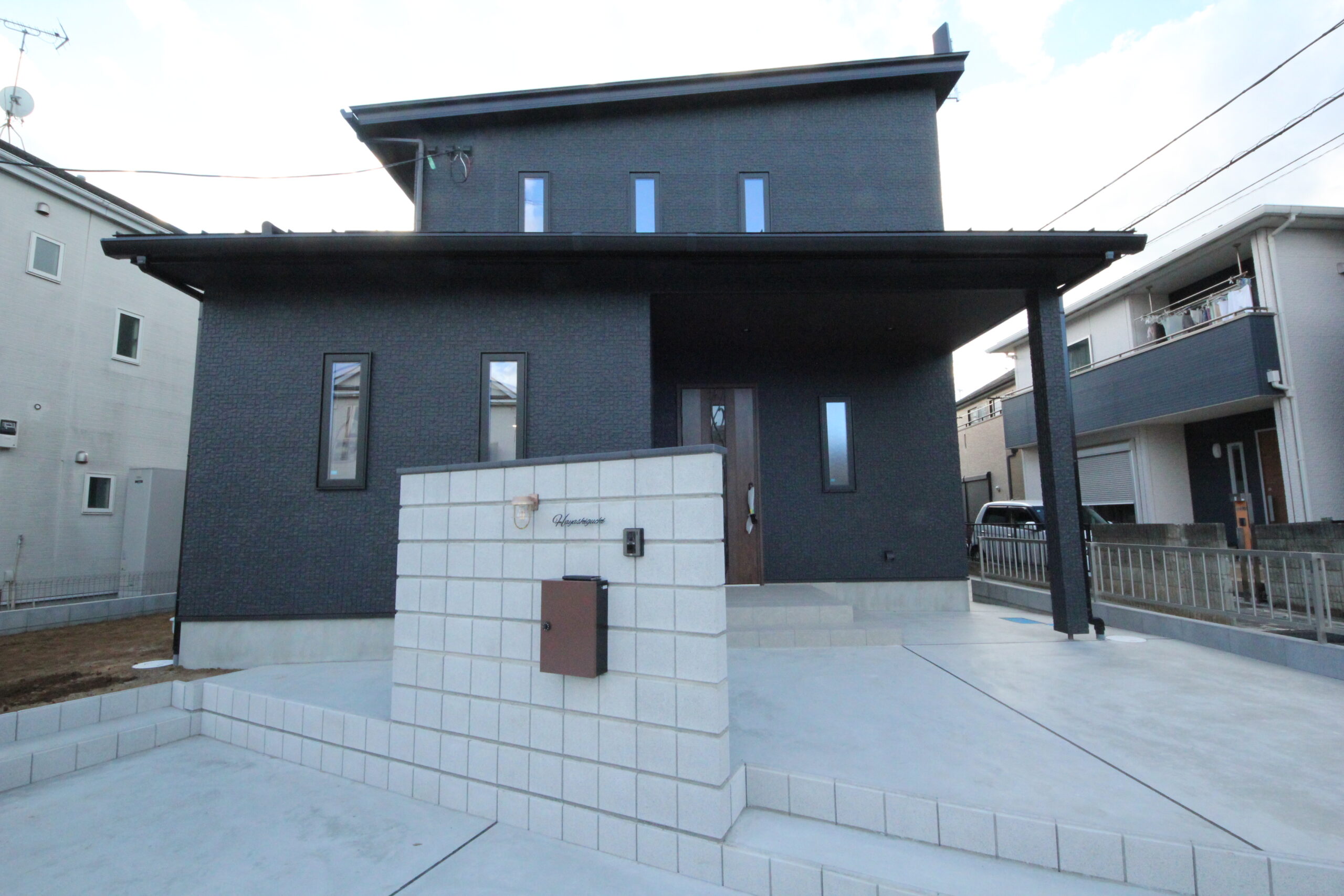 施工のポイント:奥様ご希望のブラックの外壁にその他の外装や部材もとことん黒で攻めてみました!
